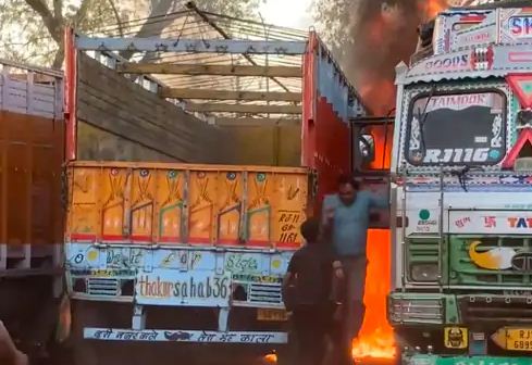 ग्वालियर: भीषण गर्मी के चलते आगजनी की घटनाएं सामने आ रही है। ग्वालियर शहर के बहोड़ापुर थाना क्षेत्र स्थित ट्रांसपोर्ट नगर में एक दर्दनाक हादसा सामने आया। यहां पार्किंग में खड़े एक ट्रक में आग लगने से पूरे इलाके में अफरा-तफरी मच गई। देखते ही देखते आग ने विकराल रूप धारण कर लिया और आस-पास खड़े अन्य ट्रकों और ट्रांसपोर्ट की दुकानों को भी अपनी चपेट में ले लिया। इसमें लाखों का नुकसान हो गया। गनीमत रही कि किसी तरह की जनहानि नहीं हुई।स्थानीय लोगों के अनुसार, ट्रक से अचानक धुआं उठता देखा गया और कुछ ही मिनटों में आग ने भीषण रूप ले लिया। गर्मी, तेज हवाओं और ईंधन की वजह से आग तेजी से फैली। जिससे हादसे के नजदीक बनी दुकानों और अन्य वाहनों में भीषण नुकसान हुआ। देखते ही देखते कई ट्रक, ट्रांसपोर्ट की दुकानें और गोदाम जलने लगे।