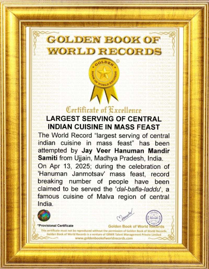 उज्जैन: कालों के काल बाबा महाकाल की नगरी उज्जैन में ऐसे आयोजन हमेशा होते रहते हैं जो नगर ही नहीं बल्कि पूरे प्रदेश में चर्चा का विषय बन जाते हैं. हनुमान जयंती के अवसर पर रविवार को भी एक ऐसा ही आयोजन हुआ जिसने वर्ल्ड रिकॉर्ड बना दिया. आंबापुरा के प्राचीन जयवीर हनुमान मंदिर में आयोजित भंडारे को गोल्डन बुक ऑफ वर्ल्ड रिकॉर्ड्स में दर्ज किया गया है. भंडारे में 50 हजार लोगों ने प्रसाद के रूप में भोजन ग्रहण किया जो अपने आप में रिकॉर्ड बन गया.
