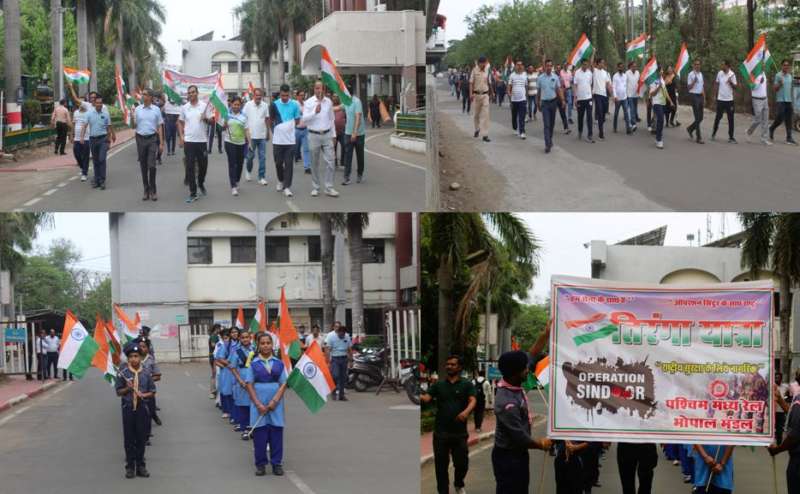 भोपाल मंडल द्वारा भारतीय सेना के अद्वितीय पराक्रम ‘ऑपरेशन सिंदूर’ की सफलता को गौरवान्वित करने हेतु एक भव्य श्रृंखला का आयोजन किया गया। इस अवसर पर स्टेशनों एवं रेलवे कार्यालयों को तिरंगे की रोशनी से सजाया गया तथा विभिन्न ऑडियो-वीडियो माध्यमों से देशभक्ति गीतों का प्रसारण कर यात्रियों और कर्मचारियों में राष्ट्रभक्ति का संचार किया गया।