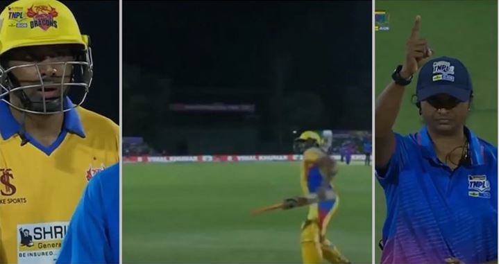 डिंडीगुल ड्रेगन के कप्तान अश्विन ने तिरुप्पुर तमिजंस के खिलाफ खेले गए मैच में पांचवें ओवर मेंबाएं हाथ के स्पिनर आर साई किशोर की गेंद पर स्वीप शॉट खेलने का प्रयास किया था। गेंद मिस होने पर उन्हें LBW आउट दे दिया गया।