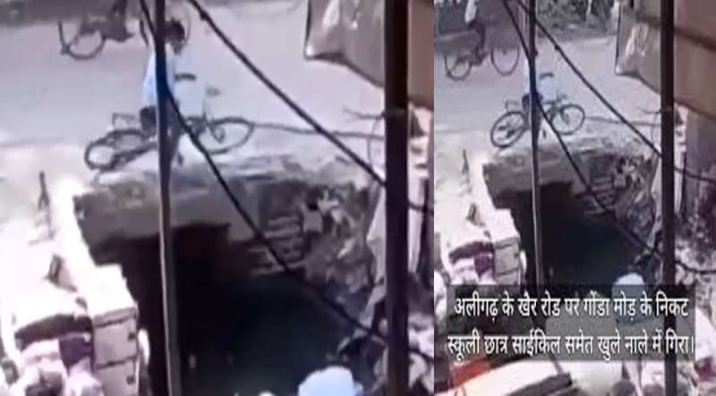अलीगढ़ : अलीगढ़ के खैर रोड पर गोंडा मोड़ के निकट नगर निगम की लापरवाही के चलते एक स्कूली छात्र की जान जोखिम में पड़ गई। सड़क किनारे बनाई गई पुलिया के बाद खुला गड्ढा छोड़ दिया गया। गहरा गड्ढा एक बड़े हादसे का कारण बनते-बनते बच गया। इस गड्ढे में एक साइकिल सवार स्कूली छात्र गिर गया। जिसका 41 सेकेंड का वीडियो सोशल मीडिया पर तेजी से वायरल हो रहा है। घटना थाना रोरावर क्षेत्र की बताई जा रही है।
