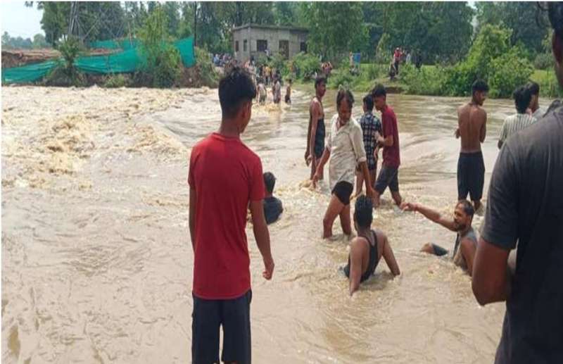 नदी पार कर रहे लोग कर रहे जान का सौदा