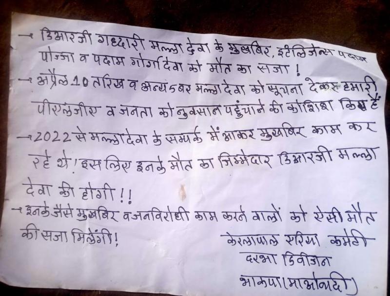घटना के बाद माओवादियों ने पर्चा जारी कर हत्या की जिम्मेदारी ली है। इसमें मृतक पदाम पोज्जा और देवेंद्र उर्फ देवा पर 2022 से पुलिस की मुखबिरी करने का आरोप लगाया गया है।