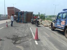 🐄 गाय को बचाने के चक्कर में ट्रक पलटा